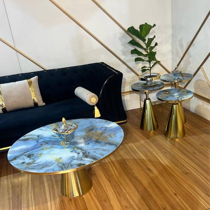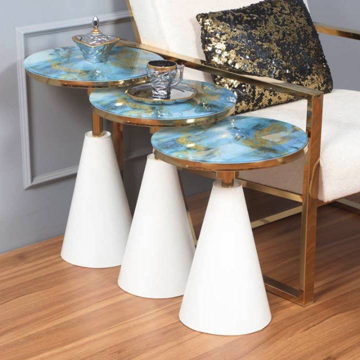 میز جلو مبلی مدل کوردلین سفید طلایی، یکی از محبوب ترین انواع ست میز جلو مبلی و عسلی می باشد. این نوع میز جلو مبلی به دلیل چایه های مخروطی تعادل زیادی داشته و در نگهداری اشیاء بسیار مقاوم است.